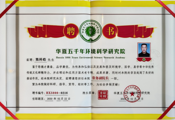 凭借在国学、易学领域的深厚造诣和卓越贡献,熊科皓在此次大典中收获诸多荣誉。鉴于他德才兼备、品学兼优,为传承和弘扬以及发展和普及环境学、国学、易学等中华优秀传统文化殚精竭虑,并在理论和应用方面术有专精、成果卓著,同时对华夏五千年环境科学研究院的宗旨起到了良好的推动作用,经研究院研究决定,聘请熊科皓担任本院常务副院长一职。此外,他还被授予“当代国学文化元老级人物,全民学习榜样”锦旗;在2025第十七届世界易学大会上,荣获“当代易学文化发展世界杰出诚信人物”称号;在第十次“关爱空巢老人·扶助留守儿童”捐赠仪式上,被授予2025年度“当代国学文化爱心传播大使”。
