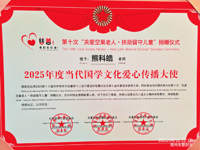 此次熊科皓受邀出席2025第七届华夏国学感恩大典并获得多项荣誉,不仅是对他个人在国学、易学领域多年努力和成就的高度认可,也为更多从事国学传承与发展的人士树立了榜样。